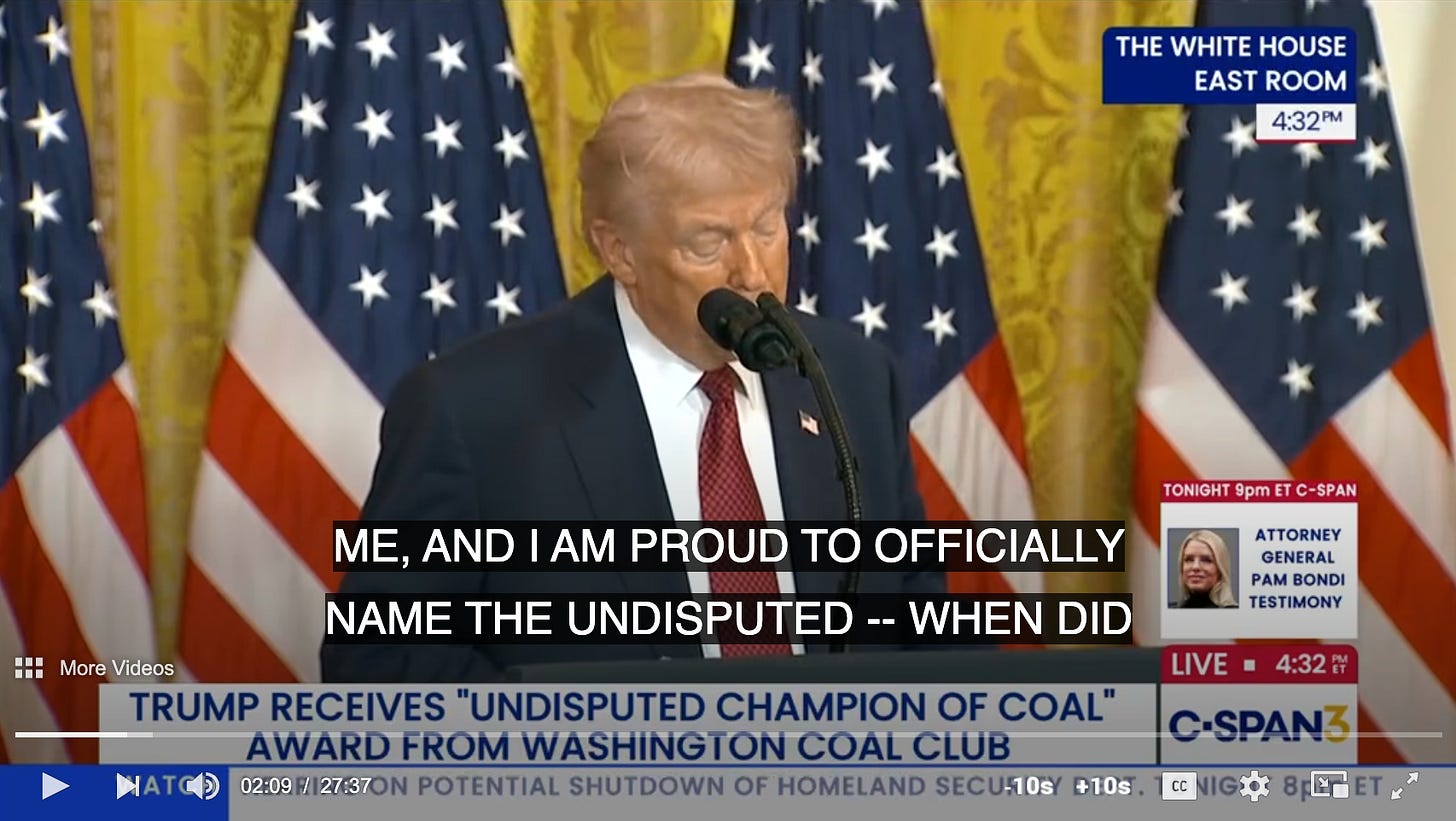 His performance troubles weren’t unexpected, but they were still jarring. Because when he first started the speech, he had this almost rehearsed enthusiasm as he repeated “clean, beautiful coal” like a chant someone had made him memorize just before going on stage. Which makes sense, because he and his cronies are following the fascists’ playbook, where if you say something enough times, people forget the truth. That’s how propaganda works. Joseph Goebbels, who ran propaganda for Hitler, once said that if you tell a lie big enough and repeat it over and over, people will start to believe it. Trump didn’t invent this strategy; he’s just messier about it. But the goal is the same. It was clear he was reading from a prepared script, probably just bullet points to keep things simple, but even that seemed too much for him. He kept looking down, confused and sluggish, struggling to get through basic words before veering off into one of his usual rambles.