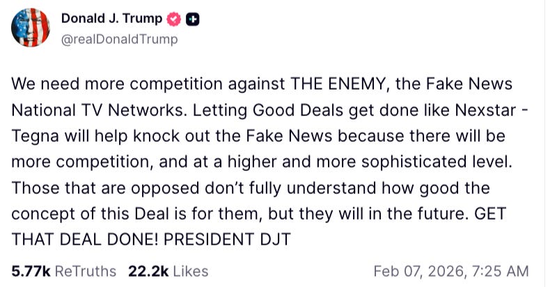 Because this isn’t about media competition. It’s about concentrating a dangerous percentage of the market under one company, crushing dissent, silencing truth, and handing control of the national narrative to a single far-right corporation already aligned with his regime.