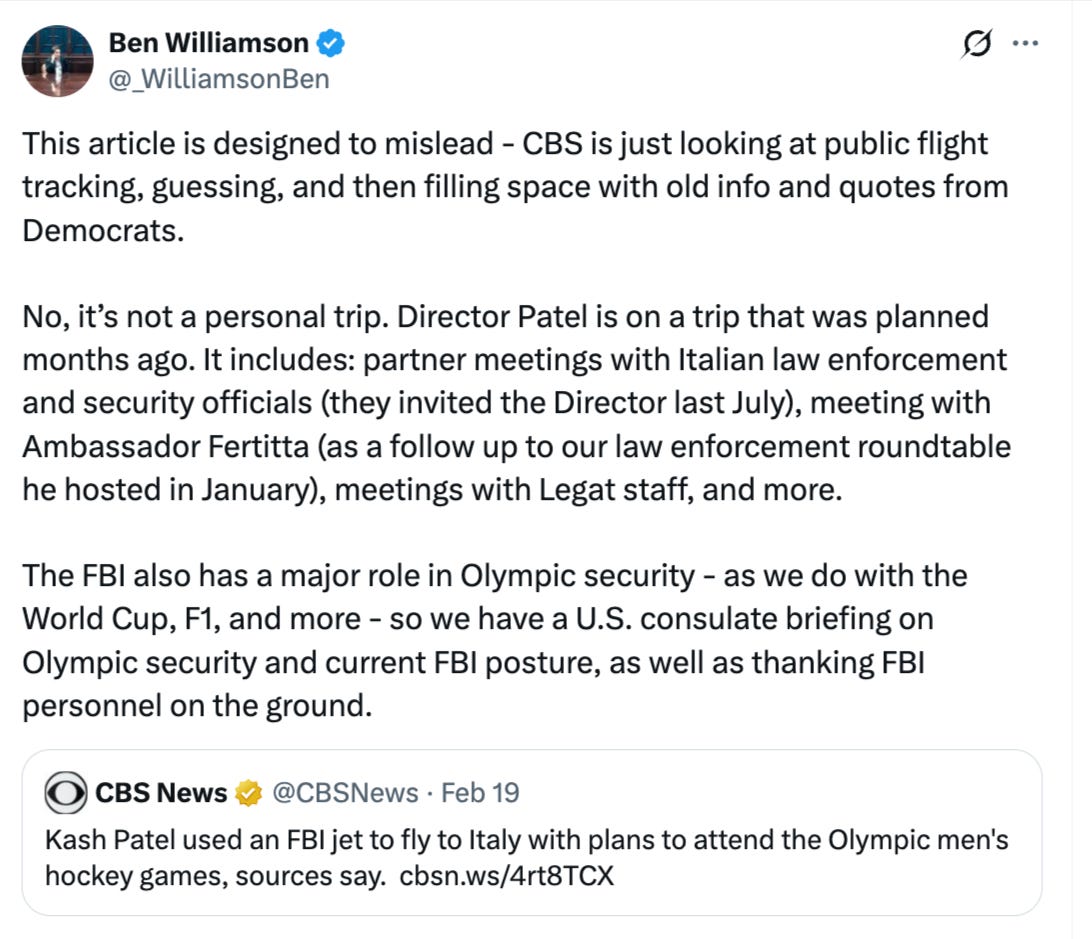 And that’s even after the FBI insisted this wasn’t what it looked like. CBS News reported: “Kash Patel used an FBI jet to fly to Italy with plans to attend the Olympic men’s hockey games, sources say.”