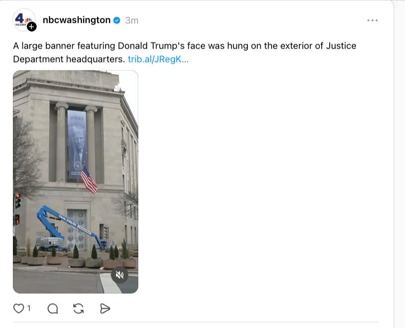 A convicted felon’s portrait now hangs on the building that houses the agency traditionally tasked with keeping law enforcement independent from political influence. It’s the symbolism that’s most concerning, and how closely it copies the authoritarian playbook. This banner on the DOJ building is an ominous warning. His face, right there, staring down at every person who enters the building. Sharing the message without saying a word. Trump is watching you. Do what he says.