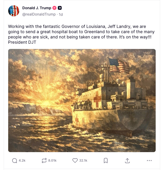 And then came the Greenland stunt. On Saturday, Trump posted on Truth Social: “Working with the fantastic Governor of Louisiana, Jeff Landry, we are going to send a great hospital boat to Greenland to take care of the many people who are sick, and not being taken care of there. It’s on the way!!!” The post included an AI-generated image of the USNS Mercy cutting through Arctic waters.